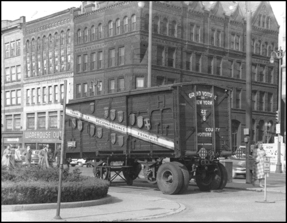 In an effort to promote the museum, the 40 & 8 Merci Train Box Car on loan to Rail City Museum, was placed on display in Clinton Square in downtown Syracuse, NY in the summer of 1956 . [Photograph by Stanley A. Groman].