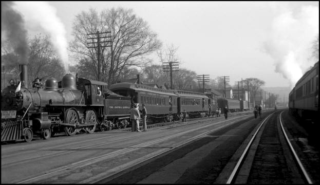 FJ&G railroad fan trip on October 27, 1946. Photo taken at the NYC RR Station in Fonda, NY. Barely visible with its distinctive FJ&G markings is the caboose acquired by Dr. Groman at the end of the train. [Photo compliments of Erwin Kistner]