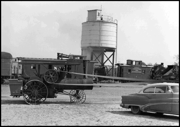 The FJ&G caboose was prominently displayed in the center of the museum next to the NYC RR Water Tower from Lowville, NY (just above the Buick automobile in the photograph). Other equipment seen in the photograph from right to left are: part of a combine attached by belt to the steam tractor, No. 38 locomotive from the H&BTM RR, FJ&G caboose No. 1, No. 63 locomotive from the Jamesville Quarry (The Solvay Process Company), a 19000 series caboose from the NYC RR, H&BT caboose in between the NYC caboose and H&BT coach, and the H&BT former electric Brill coach No. 27. [Photo by Stanley Groman, 1960]