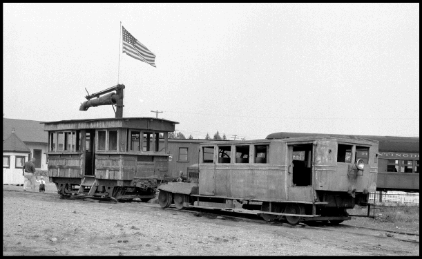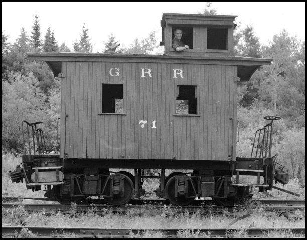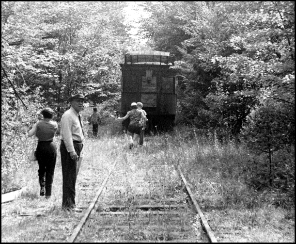 The Emporium Forestry Company would not be as profitable as the Pennsylvania operation owing to the higher costs in the Adirondacks. The company not only had the expenses of 100 employees but that of the houses, 'school' and other buildings in Conifer, NY. When the depression years came, Sykes was forced to sell half of his land holdings. William L. Sykes died in 1941 and in 1945 the last major forest land parcel was sold. Where the Sykes used to log their own timber, now the logs were brought in from the outside adding to the cost of the operation. "Perry's Pride" caboose #71 when seen by Dr. Groman on his visit to Conifer in July, 1953. Noted photographer and rail enthusiast, Norm Kistner, poses as Dr. Groman uses Kistner's camera to take the photograph. [Photograph compliments of Erwin Kistner]