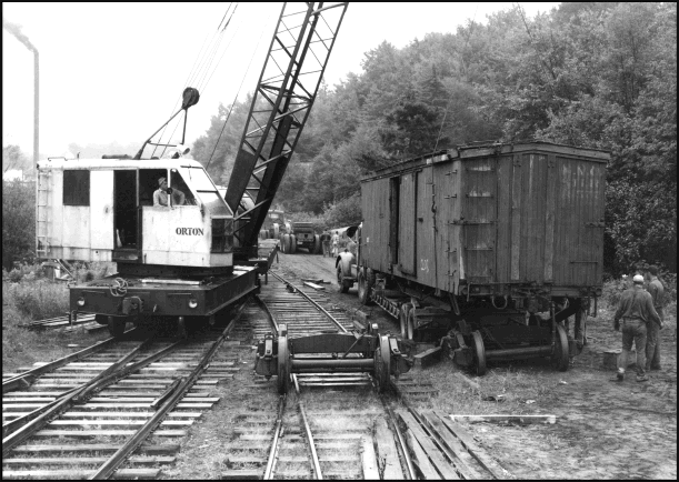 The GRR amassed a total of 21 locomotives in Conifer of which nine came from the Pennsylvania operations. In the 1950's only a few of these remained in addition to a varied assortment of weathered wooden flat cars, box cars, coaches, caboose, and Sykes-made equipment like the Rolliam and the Speeder. GRR Speeder No. 11 (right) and the "Rolliam" (in front of the speeder) on display at Rail City Museum in 1956. Both of these vehicles were constructed via the creative genius of Roy L. Sykes. The Speeder was converted from a former White bus and the Rolliam was designed and built with a discarded 1906 Thomas Flyer Model 31 Automobile engine for power. The name "Rolliam" had the first two letters of Roy and "lliam" for the two Williams who founded the Emporium Lumber corporations (William Sykes and William Caflisch) . [Photo by Stanley Groman, RCHM Photo Collection] George Sykes turns toward Dr. Groman as he snaps a photograph of his family heading toward the GRR equipment in July, 1953 at Conifer, NY. From left to right, Dr. Groman's wife, Doreen, George Sykes, Dr. Groman's son, Robert, daughter, Patricia and son, Stan Jr. [Photo by Stanley Groman, RCHM Photo Collection] Dr. Groman attempted to move the equipment by rail from Childwood to Lacona but resorted to highway transport. The cost of transporting equipment to Rail City often exceeded the original purchase price. Loading the body of Box Car No. 208 onto a flatbed truck in Conifer, NY for transport to Rail City. Each piece of equipment required two trips - one for the body and one for the two sets of trucks (wheels). Height and weight on the highways was a major concern. Special highway permits had to be acquired before moving the equipment. [Photo by Stanley Groman, RCHM Photo Collection]