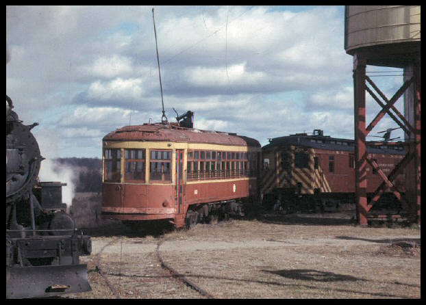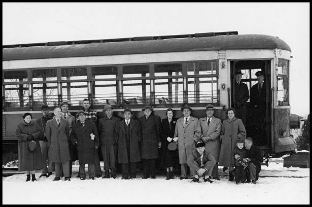 Electric rail cars operated in Rochester, NY from 1927 to 1956. When the subway neared completion in 1927, agreements were reached for the New York State Railways to operate the system. On February 4, 1928 the Rochester, Lockport and Buffalo interurbans began using the subway. On April 15, 1928 the Rochester and Syracuse cars began using the line. And the Rochester and Geneva line began using the line on October 1, 1928. The use of the subway by interurban cars one of the reasons the system was built. But it was short lived as all of the interurban lines were abandoned by June 28, 1931. "The first steam-operating railroad museum in the U.S.A." Dr. and Mrs. Groman (third and fourth standing from right) pose with members of the Syracuse Chapter of the National Railway Historical Society next to one of the RTC streetcars . The group scheduled a farewell trip in early 1956 sensing that abandonment was near. [RCHM Collection.]