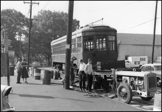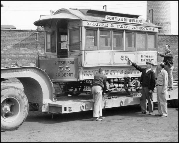 Through the efforts of the Rochester Chapter of the National Railway Historical Society, one of the 12 cars was requested to be donated to Rail City Museum. It was the only Rochester Transit Corporation car saved from the scrap heap. One of the RTC trolleys does a 'run by' on a portion of a surface line of the Rochester subway system in early 1956. Dr. Groman and his wife, Doreen, are passengers. [RCHM Collection.] Inspecting the damage to the flat-bed trailer carrying car #2010 from right to left in the photoograph: Stan Groman, Jr., his friend Tom Lane, unknown welder, Doreen Groman and unknown gentleman. [Photograph by Stanely Groman, RCHM Collection.] RTC street car #2010 on display at Rail City Museum in 1967. Behind car #2010 is the Lake Erie and Northern car #797. A portion of the water tower from Lowville, NY is to the right. On the left is part of locomotive No. 11 from the Bath and Hammondsport Railroad. [Kodachrome slide taken by Stanley Groman, RCHM Collection.] While enroute to Rail City Museum on October 11, 1956, the flat-bed trailer carrying RTC car #2010 buckled under the weight of the streetcar. It occurred during rush hour traffic on a railroad spur of the New York Central Railroad at a crossing in Ridge Road East between Hollenbeck Street and Clinton Avenue North. Road and rail traffic was blocked for several hours. Unfortunately for Dr. Groman, incidences like this would occur all to frequently while moving equipment to Rail City Museum. In addition to car #2010 from the Rochester Transit Corporation, Dr. Groman acquired two other antique streetcars from Rochester, NY to display at his Rail City Museum. The two cars were owned by the Rochester Museum of Arts and Sciences but were collecting dust in storage sheds at Edgerton Park. At the urging of the Rochester Chapter of the National Railway Historical Society, the two cars were loaned to Rail City as their storage shed was scheduled to be razed and the equipment would have become homeless. An 1890 vintage, horse-drawn, Toonerville Trolley, in mint condition, is loaded for delivery to Rail City Museum on April 24, 1956. The horse-drawn streetcar was the center of attention in a 1934 centennial celebration in Rochester, NY. Dr. Groman, second from the right, was on hand to observe and assist with the loading of the car. [RCHM Collection.] Pictured above is a sand car, the third streetcar from Rochester, NY, being prepped for transport to Rail City. [RCHM Collection.] |
